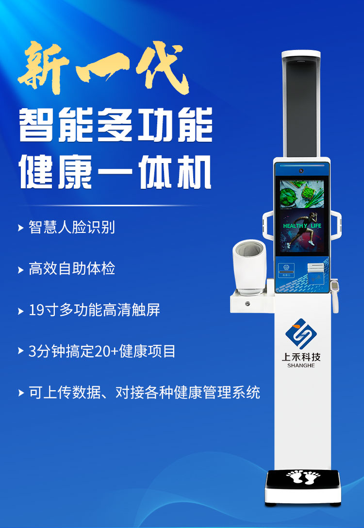 SH-V20高端健康一體機是上禾科技最新研發的一款可人臉識別的多功能健康體檢一體機,20+項身體健康指標一站完成;采用高端AI智能芯片識別人臉,采集身份信息對接第三方系統;設備擁有19寸高清液晶觸摸大屏,造型美觀大氣,雍容華貴,測量準確,品質可靠。